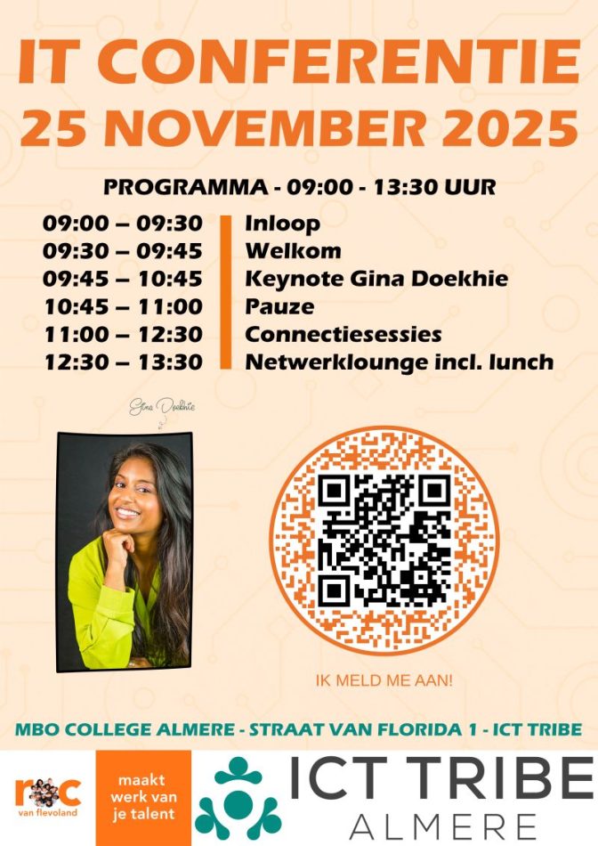 Op dinsdag 25 november organiseert ROC van Flevoland en ICT Tribe Almere de IT-Conferentie 2025 in Almere, speciaal voor bedrijven die zich willen verbinden met enthousiaste en leergierige ICT Tribe studenten en MBO-studenten van de opleidingen ICT Support & Software Development (Almere & Lelystad).