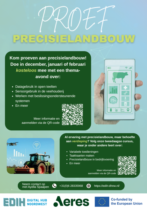 Vanuit de European Digital Innovation Hub gaan Aeres Hogeschool en Horizon thema-avonden organiseren voor primaire agrariërs. https://edih-dhnw.nl/skills-and-training/workshop-datagebruik-precisielandbouw/
